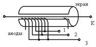 Катоды объедены в три группы, на электрод 5 - напряжение подается постоянно.