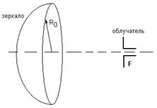 Расчет сводиться к определению геометрических размеров облучателя, при которых уменьшение амплитуды поля на краю раскрыва зеркала происходит до одной трети амплитуды поля в центре раскрыва, и диаграммы направленности облучателя.