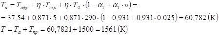Т1 = Тпр + Т0 × (1 - η) + η × Тнср = 1500 × 290 × (1 – 0.871) + 0.871 × 5 = 1542 К