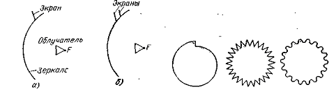 Другой путь снижения поля в заднем полупространстве состоит в использовании специальных экранов, ослабляющих рассеянное поле. Этот способ можно проиллюстрировать на примере рупорной антенны. На рисунке 17 показана обычная рупорная антенна со специальными экранами. Экраны выполнены в виде части поверхности параболического цилиндра, фокальные линии которых совмещены с кромками рупора. В такой схеме заметно снижается уровень излучения в заднем полупространстве, но конструкция является слишком сложной. В зеркальных антеннах могут быть использованы более простые плоские экраны, как показано на рисунке 18,а и б. Использование одного экрана позволяет уменьшить уровень поля в заднем полупространстве на 8...14 дБ. Два последовательно расположенных экрана обеспечивают уменьшение уровня поля на 20... 25 дБ. Эти экраны могут выполняться из листового металла или густой проволочной сетки, причем жестких требований к точности выполнения и установки экранов не предъявляется.