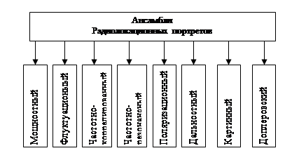 Постановка любой задачи всегда предполагает формализацию основных категорий, положенных в основу ее решения. В данном случае такой категорией является радиолокационный портрет. Под радиолокационным портретом будем понимать совокупность N комплексных амплитуд принятого сигнала En, относящихся к различным элементам пространства распознавания. В зависимости от положенных в основу распознаваний классификационных признаков пространством распознавания может быть время, частота, время запаздывания, доплеровское смещение частоты, пространственная (угловая) частота, поляризационный базис. Ниже рассматриваются ансамбли радиолокационных портретов, связанных с каким-то одним классификационным признаком, и как следствие, с одномерным пространством распознавания. К таким портретам относятся (рис.1): мощностный, флуктуационный, частотно-коррелированный, частотно-резонансный, поляризационный, дальностный, картинный, доплеровский. Эти портреты следует называть простыми. Возможно использование нескольких классификационных признаков и, как следствие, многомерного пространства распознавания. Такие портреты следует называть сложными или комбинированными.