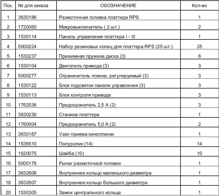 Трехдисковый плэттер выгодно отличается простотой конструкции и легким обслуживанием. На плэттере возможно одновременно с демонстрацией одного производить подготовку второго фильма. Главное особенность этого устройства - возможность нормально продолжить работу, даже если на датчик скорости сматывания, находящийся в центре диска с которого идет демонстрация фильма, намоталось много пленки. В этом случае не произойдет рывка и остановки плэттера. Так же датчик не боится загрязнения, чувствительность его может быть легко отрегулирована.