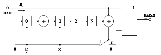 В исходном состоянии ключ находится в положении 1, на вход устройства поступает первичная кодовая комбинация f(x) (начиная со старшего разряда). Через k-тактов вся первичная кодовая комбинация поступит на выход, а в результате деления (благодаря обратной связи) образуется остаток. Ключ переключается в положение 2. Таким образом, через n-тактов на выходе получим F(x).