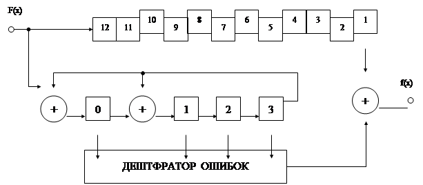 Исходная комбинация F(x) подается в буферный регистр и одновременно в декодирующий регистр. Если с приходом последнего символа, зафиксирован нулевой остаток (синдром 0000), то ошибок нет, если же не нулевой, то есть. Принятая комбинация подается через выходной сумматор, и искаженный сигнал исправляется.