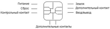 У смарт-карт нет источника питания, дисплея и клавиатуры. Взаимодействие с окружающим миром производится с помощью последовательного коммуникационного интерфейса, имеющего восемь контактов. Расположение и размеры контактов описываются во второй части стандарта ISO 7816. На рис. 2 показаны контакты смарт-карты.