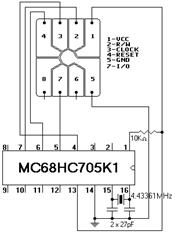 Реализацию эмулятора на этом принципе можно осуществить двумя путями. Первый состоит в том, что собирается логическая схема, осуществляющая всю логику работы схемы «аппарат-карта». Второй же способ основан на применении микроконтроллеров. В основном, используют микроконтроллеры из PIC-серии. Наиболее приемлемым является использование контроллера МС68НС705К1 фирмы Motorola. Во-первых, его довольно легко найти, во-вторых, он дешев, в-третьих, в этом контроллере огромное количество функций. Собираем программатор по схеме, приведенной на рисунке 14: