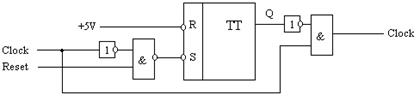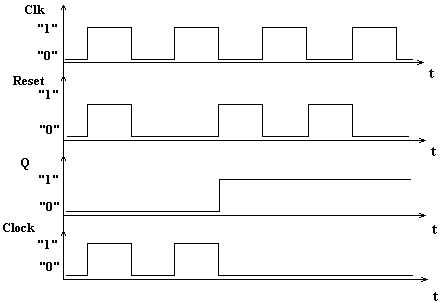 Когда схема на одном RS триггере принимает импульс по Reset то на выходе тригера появляется «1» и сигналы Clock не смогут дальше пройти.