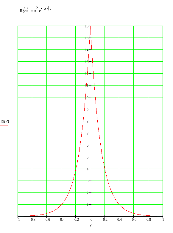 Тепер будуємо графіки кореляційної функції на вході лінійної системи (рис.1.1), а також енергетичний спектр (рис.1.2). При цьому ми прийняли, що дисперсія вхідного сигналу дорівнює 4, а коефіцієнт ![]()