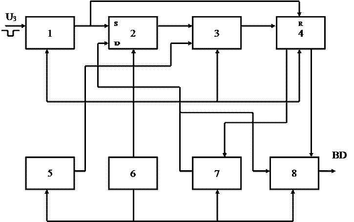начинает пропускать импульсы мультивибратора на вход двоичного суммирующего счетчика, который подсчитывает их количество. Как только количество подсчитываемых импульсов достигает заданной величины, комбинационная схема 2 (блок 7) вырабатывает сигнал, который переключает триггер 2 в нулевое состояние, после чего импульсы мультивибратора не подаются на вход счетчика 4.Схема фиксируется в этом состоянии до прихода следующего запускающего импульса.
