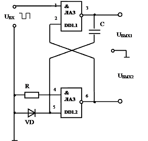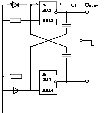 И-НЕ DD1.1 , DD1.2 , резисторы R1 , R2 и конденсаторы C1 , C2 времязавдающие цепи (ВЗЦ), защитные(демпфирущие) диоды VD1 , VD2 .