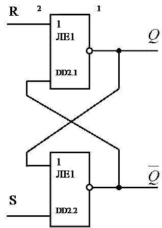 Соединения логических элементов таковы,что если на входе одного из них установлен потенциал, соответствующий коду 0, то на выходе другого будет потенциал логической единицы.Изменение сигналов на выходах триггера приводит тому, что схема принимает новое устойчивое состояние, в котором