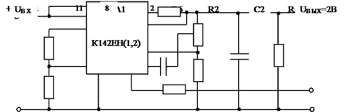 С помощью конденсатора С1 и С2 обеспечивается устойчивая работа микросхем . Так как UВЫХ = +5В С1 = 100пф; С2 = 1мкф.