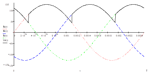 так же, как и в однофазном выпрямителе, имеются интервалы, соответствующие работе одного и двух вентилей.