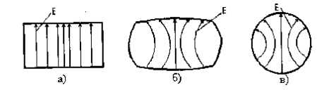 Так, считается, что проводимость стенок волновода бесконечно велика, волновод неограниченно протяжен и однороден вдоль оси z , а внутренней средой является воздух или вакуум. Контур сечения волновода можно преобразовать из прямоугольного в круглый путем последовательных деформаций. Картину поля в волноводе следует строить исходя из того, что силовые линии электрического вектора всегда подходят к металлическим стенкам по направлению нормали. В конечном итоге получаем картину одного из типов волн в круглом волноводе рис.2в. Есть основание полагать, что эта картина соответствует основной волне круглого волновода. В дальнейшем этот факт будет строго доказан.