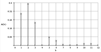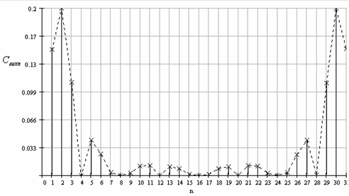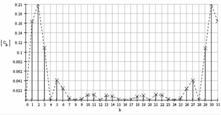 , причому останню гармоніку в спектрі беремо на рівні 0.1 від гармоніки з максимальною амплітудою.
