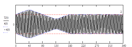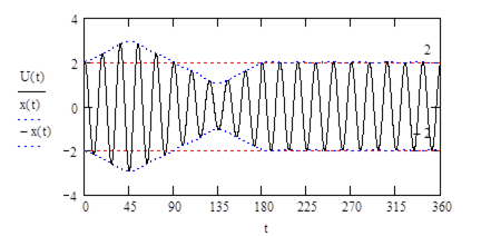 Параметри RC - кола підібрані так, що амплітуда на виході, змінюючись повільно порівняно з несучою, повторює амплітуду ВЧ - коливань на вході. Таким чином, на конденсаторі гаситься високочастотна складова, а на вихід проходить лише огинаюча вхідного сигналу. На рис.5.3 представлений ВЧ - сигнал на вході: АМ - коливання та пунктиром його огинаюча, на рис.5.4 - сигнал на виході детектора при ідеальному детектуванні.