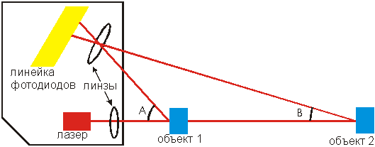 На рисунке показан принцип работы оптического датчика расстояния. Лазер посылает через линзу луч, который отражается от объекта и фокусируется на линейке из фотодиодов, которая прообразует световой сигнал в электрический. Всякое изменение расстояния до объекта вызывает изменение угла отраженного луча и, следовательно, позиции, которую отраженный луч занимает на линейке фотодиодов. Микроконтроллер обрабатывает сигнал от линейки фотодиодов и преобразует его в аналоговый электрический сигнал.