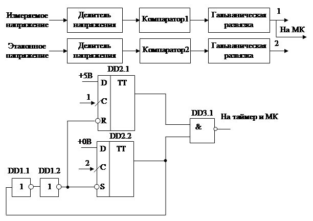Измеряемое и эталонное напряжение подается на вход компараторов через ограничители напряжения, который обрезает напряжения большие некоторой величины. Это сделано из-за того, что максимальное значение напряжения сигнала может достигать 100В, а на компараторы нельзя подавать напряжение большей величины чем значение напряжения питания. После компараторов сделана гальваническая развязка. Гальваническая развязка сделана в этом месте из таких соображений: