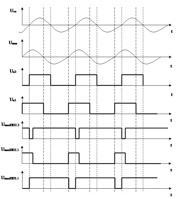 Исходя из этого, узел на микросхемах DD1-DD3 работает следующим образом. Объяснение работы схемы лучше всего начать с момента прихода положительного фронта на вход защелки триггера DD2.2 (переход эталонного напряжения из отрицательного значения в положительное). В этот момент времени на прямом выходе триггера DD2.2 установится логический «0», что вызовет установку на выходе триггера DD2.1 логического «0» (так как выход триггера DD2.2 связан со входом сброса триггера DD2.1), на выходе триггера DD2.2 вновь появится сигнал высокого уровня. Фактически по первому переднему фронту на защелке триггера DD2.2 происходит инициализация этой системы. Теперь она готова к работе. При переходе измеряемого напряжения из отрицательных значений в положительные, на вход C триггера DD2.1 поступает положительный фронт. Так как на его вход D поступает сигнал логической «1», то и на выходе триггера DD2.1 появится сигнал логической «1». До этого на его выходе был логический «0». Так как сигналы с выходов триггеров DD2.1 и DD2.2 поступают на входы микросхемы 2И DD3.1, то на ее выходе в промежуток времени между переходами измеряемого и эталонного напряжения через ноль будет сигнал логической «1». После того как напряжение эталонного сигнала перейдет из отрицательного значения в положительное, то произойдет процесс инициализации и на выходе системы вновь появится сигнал логического «0». Согласно этому, на выходе системы будет сигнал логической «1» в промежуток времени между событиями перехода из отрицательного значения в положительное напряжений измеряемого и эталонного сигналов. Для научного представления представим этот процесс в виде временных диаграмм.