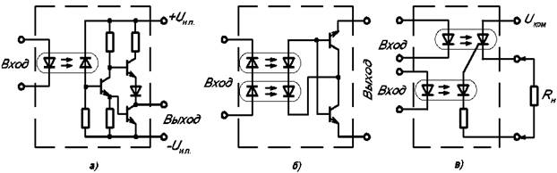 Рис. 2. Электрические схемы некоторых типов оптоэлектронных микросхем: а – ключевая микросхема; б – аналоговый ключ; в – реле постоянного тока.