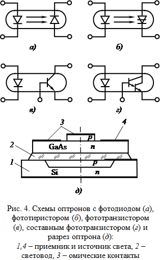 Отношение коэффициента передачи тока к времени переключения называется добротностью оптрона и составляет 105 – 106 для фотодиодных и фототранзисторных оптронов. Широко используют оптроны на основе фототиристоров. Оптроны на фоторезисторах не получили широкого распространения из-за низкой временной и температурной стабильности. Схемы некоторых оптронов приведены на рис. 4, а – г.
