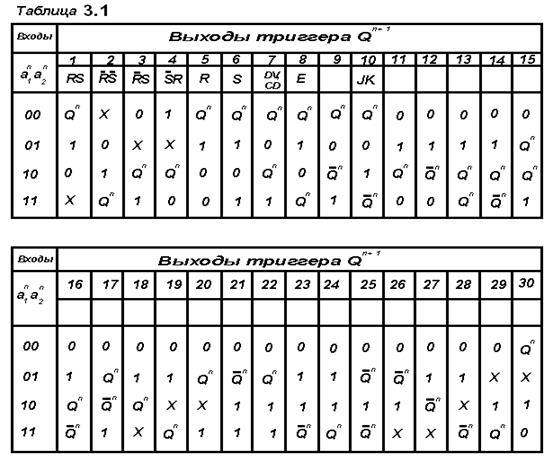 Каждый из этих триггеров (автоматов) (табл. 1.) может быть исследован на предмет его принадлежности к элементарному триггеру. Однако элементарные триггеры необходимо выбирать среди автоматов, в которых отсутствуют состояния типа