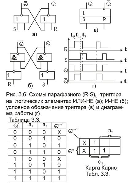 Схемы RS-триггеров, построенные по уравнениям (2) и (3), их обозначения и диаграммы работы приведены на рис.3.