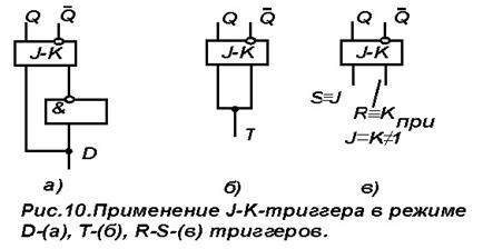 Поскольку для выполнения такого требования в состав триггера необходимо дополнительно ввести схему управления, то схема триггера, приведенная на рис. 3.9. не является элементарной. Триггер J-K-типа относится к разряду универсальных триггеров, поскольку на его основе путем несложных внешних комбинационных изменений можно получить схемы выполняющие функции R-S,D- и T- триггеров. Способы применения триггера J-K-типа в качестве D-, T- и R-S-триггеров показаны на рис. 7.