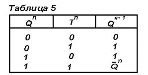 Триггер Т-типа (счетный триггер) называют логическое устройство с двумя устойчивыми состояниями и одним входом Т, изменяющее свое состояние на противоположное всякий раз, когда на вход Т поступает управляющий (счетный) сигнал. Закон функционирования триггера Т-типа приведен в таблице 5.