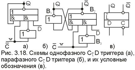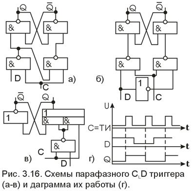 Различные схемные варианты триггеров D-типа приведены на рис. 13, а - в. Поскольку все триггеры вида L, то необходимо следить за тем, чтобы во время действия ТИ информация на входе оставалась постоянной (рис. 13, г). Анализируя схемы на рис. 13, а-в, нетрудно заметить, что все они выполняют одну и ту же логическую функцию, имеют одну и ту же диаграмму входных и выходных сигналов (рис. 13, г), но вместе с тем реализуется на различном числе элементов.