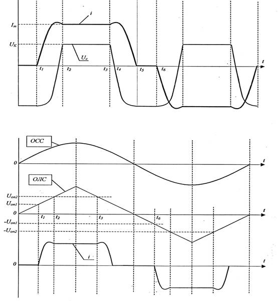 В момент времени t1 подаются отпирающие импульсы на управляющие выводы тиристоров VS1, VS4, VS5, VS8. Ток источника протекает по контуру Е-VS1-C-VS4-VS5-H-VS8. (Здесь Н – нагрузка). При этом формируется фронт импульса тока нагрузки (рис.3). В момент t2 включается тиристор VS3, при этом VS4 выключается, т.к. к нему прикладывается напряжение конденсатора С в обратном направлении. Начиная с этого момента ток протекает по контуру Е-VS1-VS3-VS5-H-VS8. При этом формируется плоская часть импульса тока нагрузки (рис.3). В момент времени t3 включается тиристор VS2, при этом VS1 выключается, т.к. к нему во встречном направлении прикладывается напряжение конденсатора С. Начиная с этого момента ток замыкается по контуру Е-VS2-C-VS3-VS5-H-VS8 и формируется спад импульса тока нагрузки. В момент времени t5 ток становится равным нулю и тиристоры VS2, VS3, VS5, VS8 естественным образом выключаются. На этом заканчивается формирование положительной полуволны импульса тока. В момент времени t6 вновь подаются отпирающие импульсы на тиристоры VS1, VS4 коммутирующего моста и другую пару тиристоров VS6, VS7 реверсивного моста. Последовательность включения тиристоров коммутирующего моста остается прежней и в нагрузке формируется аналогичный первому импульс тока, имеющий противоположное направление. Важно иметь в виду, что временные интервалы t3 …t4 и t5… t6 не могут быть меньше определенной величины, определяемой свойствами тиристоров. Алгоритм управления тиристорами и пояснение работы схемы представлено на рис 3.