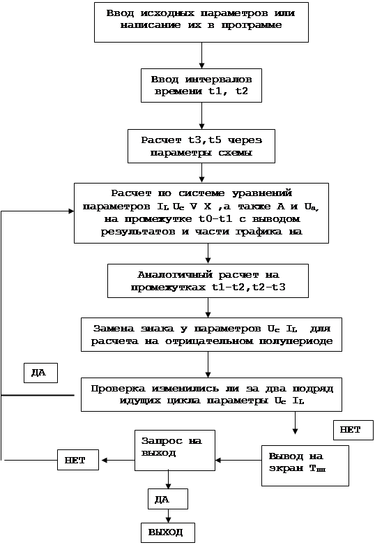 а) составляем программу, которая рассчитывает параметры IL, Uc , X, V на каждом шаге интегрирования. Задаем значения t1 и t2 при которых обеспечивается заданное время выключения тиристоров 50мкс (t3 …t4 ; t5 …t6 ).
