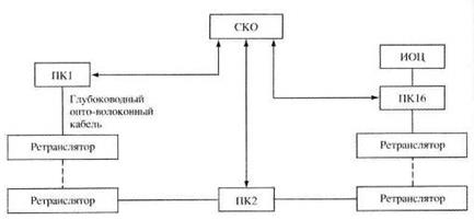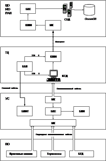 В настоящее время ведется работа над проектом территориально-распределенного программно-аппаратного комплекса мониторинга морской экосистемы, который может использоваться как для оперативного реагирования на изменение ключевых характеристик окружающей среды, по которым можно судить о состоянии экосистем водной толщи и морского дна в условиях антропогенного воздействия, так и для анализа и прогнозирования изменения экологической обстановки на длительный период времени. Работа этих систем должна сочетаться со спутниковыми наблюдениями за поверхностью океана и периодическими судовыми научными исследованиями на обширных акваториях Мирового океана. Программно-аппаратный комплекс состоит из подводной обсерватории, обеспечивающей измерение ключевых характеристик морской экосистемы в течении длительного промежутка времени, и программно-аппаратных средств по приему, обработки, хранения и анализа полученных от обсерватории данных. (Рис. 1) К программно-аппаратным средствам по приему, обработки, хранения и анализа полученных от обсерватории данных относятся: узел связи (УС), региональный центр обработки информации (РЦО), главный центр хранения и обработки данных (ЦО). [4]
