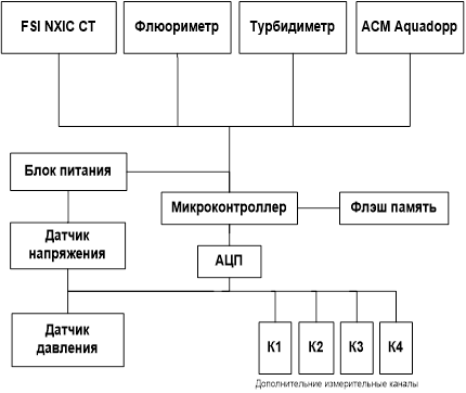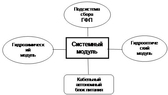 Подводная обсерватория имеет модульную структуру (Рис. 2) и состоит из: подсистемы сбора ГФП; гидрохимического модуля; гидрооптический модуля; системного модуля; автономномного или кабельного блока питания. Обязательным в составе ПО является наличие подсистемы сбора ГФП, системного модуля и кабельного или автономного блока питания.