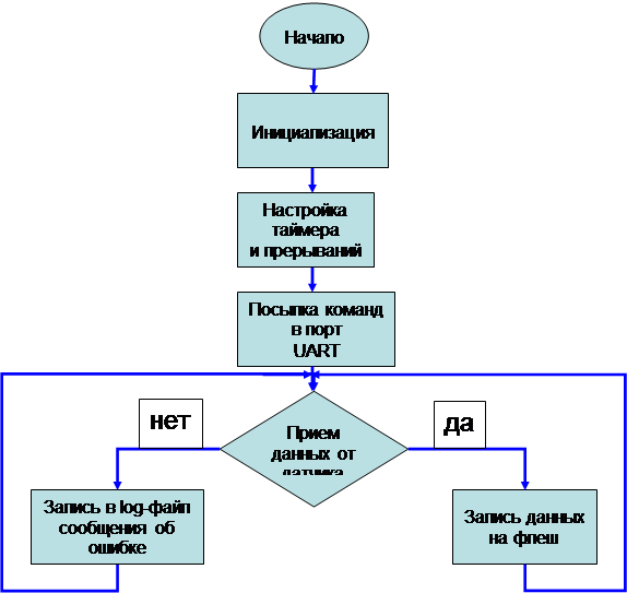 Используя полученные сведения, была разработана структурная и электрическая принципиальная схемы устройства, алгоритм работы подсистемы сбора ГФП и программное обеспечение для микроконтроллера, позволяющеее проводить гибкую настройку обсерватории в зависимости от применяемых датчиков, и режимов работы.