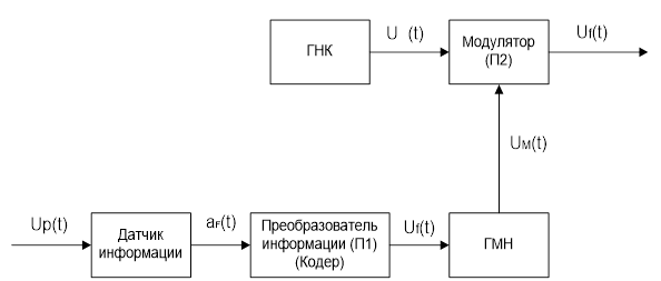 Преобразователь П1 – устройство формирования НЧ информационного сигнала UF(t). П1 осуществляет преобразование aF(t) UF(t). Для импульсных РС П1 представляет собой ПЗУ или кодер – АЦП (аналогово-цифровой преобразователь);