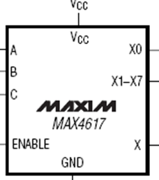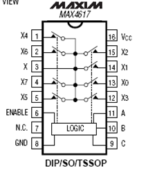 MAX4617 являются быстродействующей, низковольтной, аналоговой КМОП микросхемой, конфигурированной как 8 канальный мультиплексор