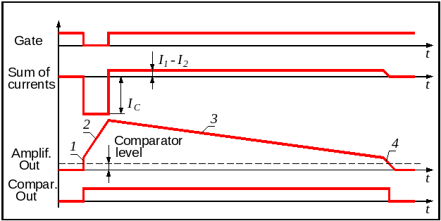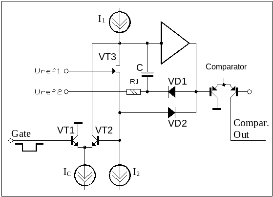 ВЦП работает следующим образом. После предыдущего цикла измерения (или после команды сброса) ВЦП находится в состоянии готовности к приёму сигналов. При этом зарядный ключ "выключен", т.е. зарядный ток IС протекает через правый (по схеме) транзистор ключа и, соответственно, не поступает на запоминающую ёмкость C. Ток I2 равен половине I1 . Дополнительный ток, равный разности (I1-I2), отбирается цепью ООС. Таким образом, заряд запоминающей ёмкости С не меняется, и напряжение на входе усилителя устанавливается соответственно условию равновесия в петле ООС. Усилитель находится в состоянии готовности к переключению. На выходе компаратора низкий логический уровень.