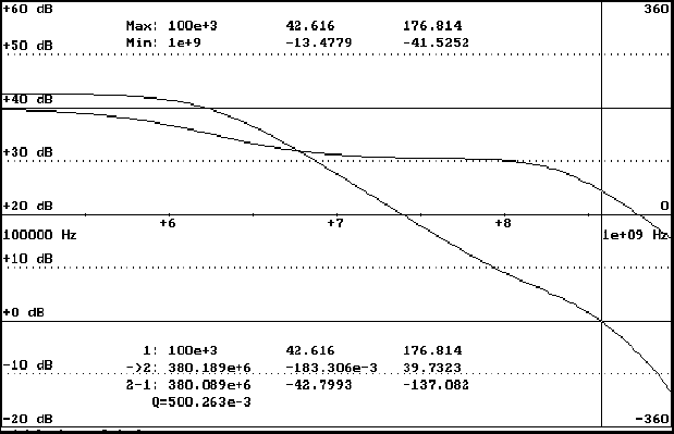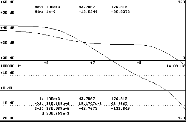 Расчетные характеристики усилительного звена с правильной коррекцией (о подборе коррекции см. ниже) показаны на рис.6 . Коэффициент усиления на низких частотах около 140, произведение коэффициента усиления на частоту не менее 250*106.