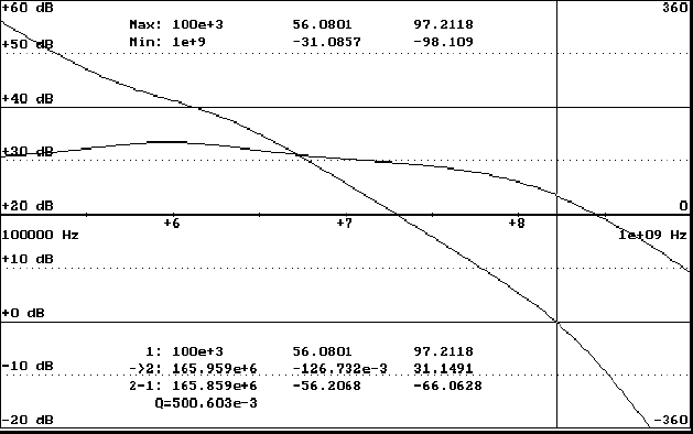 Для определения запаса устойчивости схемы с ООС выход цепи ООС в модели нагружается на каскад, идентичный входному каскаду усилителя. Моделирование показало, что при правильном выборе корректирующих элементов R6C5 усилитель устойчив с обеими петлями ООС (рис.7, 8). Запас по фазе составил не менее 31°.