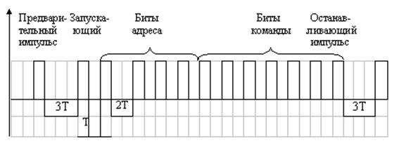 2. Специальный раздел. 2.1. Принцип функционирования схемы. Схема дистанционного управления (ДУ) генерирует последовательность коротких импульсов ИК излучения, в соответствии с нажатой кнопкой на панели ДУ. Каждая последовательность состоит из 14 импульсов, из которых 11 импульсов информационных, а также предварительный, запускающий и останавливающий импульсы. С помощью 11 информационных импульсов, мы передаем сигнал ДУ, который представляет собой десяти битовое слово. Его четыре первых бита, отведены для передачи адреса, а остальные для передачи команды. Таким образом, можно сформировать 16 групп адресов по 64 команды в каждой (в нашем случае будем использовать 16 команд с одним строго определенным адресом). Двоичная информация каждого бита определяется длительностью интервалов между импульсами. Логическому «0» соответствует основной интервал времени Т, логической «1» – 2Т. Временной интервал между предварительным и запускающим импульсами – 3 Т, между запускающим и первым информационным – Т, между последним информационным и останавливающим – 3Т.