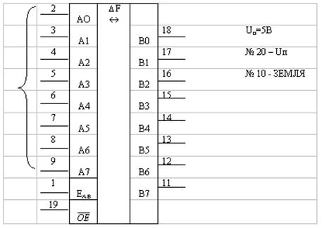 Шина данных микропроцессора 1821ВМ85. Шина данных в отличие от шины адреса является двунаправленной. Значит необходимо предусмотреть буфер, который по соответствующим сигналам управления от МП будет пропускать данные как к МП, так и от него. В качестве двунаправленного буфера будем использовать микросхему 1533 АП6. Микросхема 1533 АП6 содержит 8 ДНШУ с тремя состояниями выводов, два входа разрешения ЕАВ