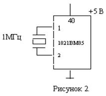 Генератор тактовых импульсов для микропроцессора 1821 ВМ85. Схема генератора тактовых импульсов микропроцессора 1821ВМ85 содержится в самом микропроцессоре. Достаточно подключить кварцевый резонатор к выводам № 1 и № 2 МП. Кварцевый резонатор может иметь любую частоту колебаний в диапазоне от 1 до 6 МГц. Эта частота делится пополам, и соответствующие импульсы используются в МП. На рисунке 2 показана схема подключения кварцевого резонатора, в результате чего обеспечивается синхронизация МП 1821ВМ85.