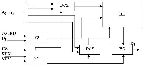 Рисунок 3 НК – накопитель; DCX, DCY – дешифраторы строк и столбцов; УЗ – устройство записи, УС – устройство считывания, УУ – устройство управления. Т.к. ОЗУ организовано как 2Кх8, значит необходимо использовать АО |