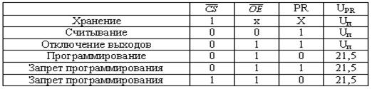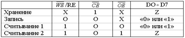 Для управления функционированием схемы используется 3 вывода: 1) 2) CE - № 18 3) OE - № 20 Микросхема 537РУ10 функционирует в 3 режимах: - режим хранения данных - режим считывания данных - режим записи данных Таблица истинности: