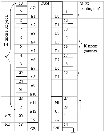 Постоянное запоминающее устройство. Структурная схема ПЗУ аналогична структурной схеме ОЗУ, только отсутствует устройство записи, т.к. после программирования ПЗУ, информация из него только считывается. Так как ПЗУ организована как 8к х 8, значит необходимо использовать А0 Для управления функционирования схемы используются 2 вывода: CS - №20, ОЕ - №22. Микросхема 573РФ4 функционирует в 2-х режимах: режим хранения и режим считывания. Считывание информации производится по 8 бит. В качестве сигналов управления будем использовать сигнал RD и сигнал, который будет поступать по старшей адресной линии. Таблица истинности: