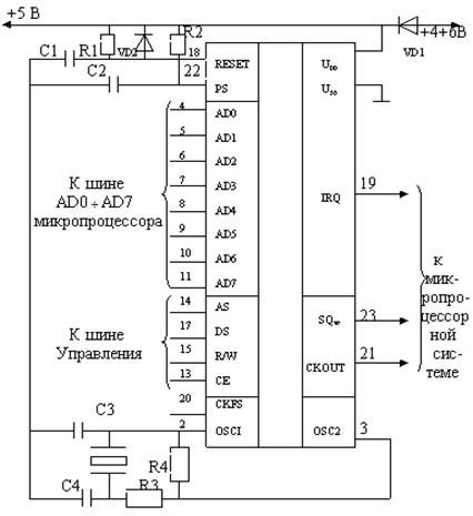 Сигнал тактового генератора можно снять с выхода CKOUT для использования в других устройствах системы. Он поступает на этот вход непосредственно (CKFS=1) или после деления частоты на четыре (CKFS=0). Микросхема имеет выход ещё одного сигнала (SQW ), получаемого делением частоты тактового генератора. Коэффициент деления задается командами, поступающими от процессора. Включается и выключается этот сигнал также командами процессора. Микросхема связана с микропроцессором через двунаправленную мультиплексированную шину адреса – данных (AD0 |