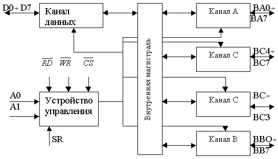 В режиме 1 обеспечивается возможность ввода или вывода информации в/или из периферийного устройства через 2 независимых 8 разрядных канала ВА, ВВ по сигналам квитирования. При этом линии канала С используются для приема и выдачи сигналов управления обменом. В режиме 2 обеспечивается возможность обмена информацией с периферийными устройствами через двунаправленную 8 разрядную шину ВА по сигналам квитирования. Для передачи и приема сигналов управления обменом используются 5 линий канала ВС. Выбор соответствующего канала и направление передачи информации через канал определяется сигналами А0, А1 и сигналами |
