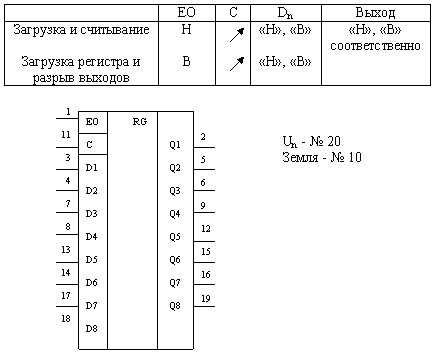 Регистр – это линейка из нескольких триггеров. Можно предусмотреть логическую схему параллельного отображения на выходах состояния каждого триггера. Тогда после заполнения регистра от параллельных выводов, по команде разрешения выхода, накопленное цифровое слово можно отобразить поразрядно сразу на всех параллельных выходах. Для удобства поочередной выдачи данных от таких регистров (буферных накопителей) в шину данных процессора параллельные выходы регистров снабжаются выходными буферными усилителями, имеющими третье, разомкнутое Z состояние. Микросхема 1533ИR22 – восьмиразрядный регистр – защелка отображения данных, выходные буферные усилители которого имеют третье Z –состояние. Пока напряжение на входе №11 высокого уровня, данные от параллельных входов отображаются на выходах. Подачей на вход № 11 напряжения низкого уровня, разрешается запись в триггеры нового восьмибитового байта. Если на вход № 1 подать напряжение высокого уровня, выходы микросхемы переходят в 3-е Z состояние. Таким образом, с помощью микросхемы 1533ИR22 мы фиксируем адресную информацию, поступающую от МП. |