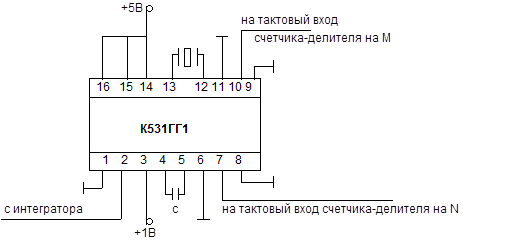 Микросхема 531ГГ1-представляет собой два генератора. Частота каждого генератора управляется напряжением. Каждый генератор представляет собой автомультивибратор , имеющий вход управления частотой (УЧ) выводы 1 и 2 и диапазоном частоты (Д) выводы 14 и 3. К выводам 12 и 13 подсоединим кварцевый резонатор КР374 на 16МГц. 16,15 - Uп; 9,8-общий вывод. Для обеспечения заданного диапазона частоты ко входам 4-5 присоединяем конденсатор емкостью с=2 пФ (КД‑1‑2пФх100В ).
